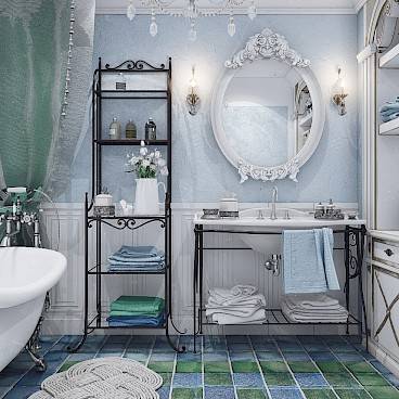 Отделка ванной и туалета в стиле прованс традиционно выполняется в светлых тонах. Кафельная плитка может быть однотонной или с легким цветочным узором. Так же гармонично смотрится плитка с эффектом старины и потертостей. Полезную функцию в интерьере ванной выполняют плетеные корзины и кованые этажерки.